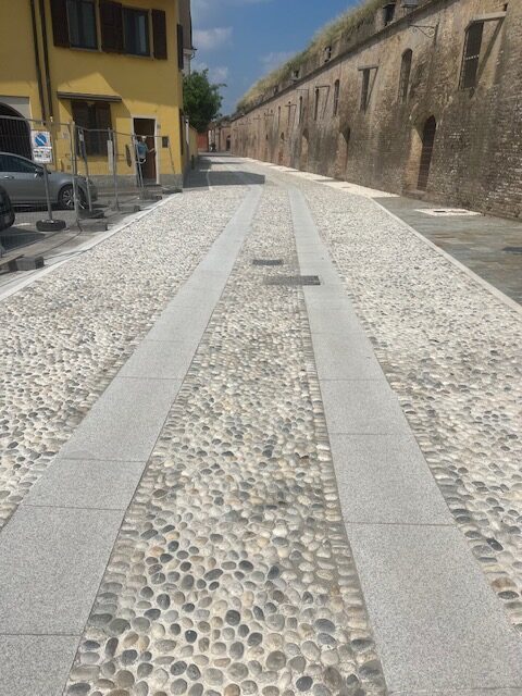 Realizzazione di nuove pavimentazioni di design lungo la storica via del centro cittadino, con un’alternanza di lastre in Luserna e acciottolato di fiume, e due direttrici centrali in granito. Intervento commissionato dal Comune di Pizzighettone.